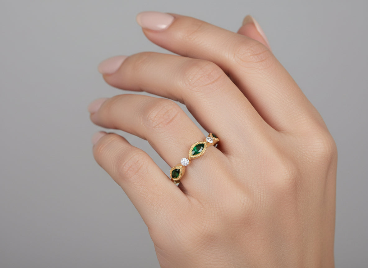 14K yellow gold ring featuring a vibrant emerald (0.14 CTW) accented with sparkling diamonds (0.04 CTW). This elegant ladies' ring combines timeless craftsmanship with refined sophistication. The warm glow of yellow gold complements the rich green of the emerald, creating a striking yet versatile piece suitable for everyday wear or special occasions. A classic design that celebrates natural gemstone beauty.