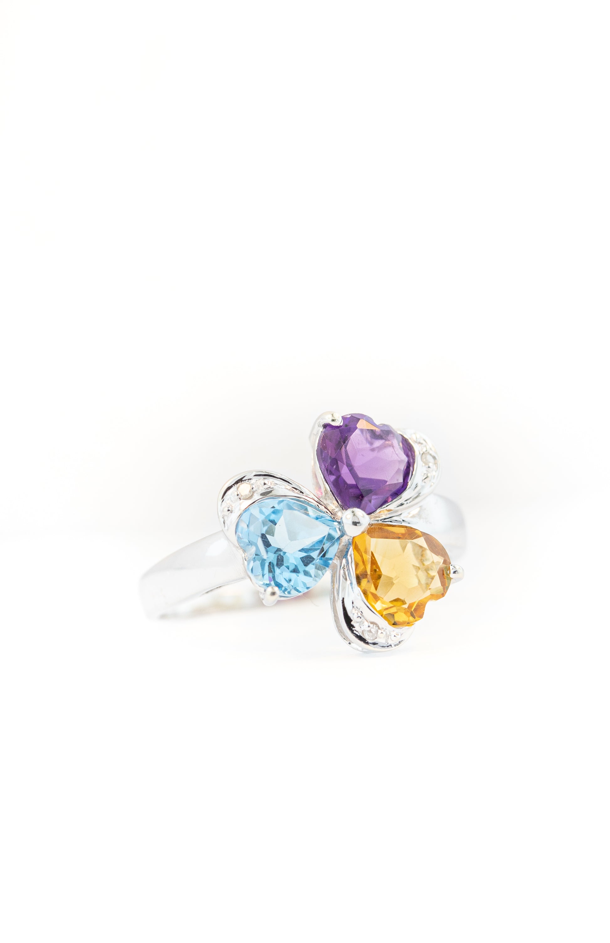 This exquisite 14kt white gold tri-color ladies ring features a harmonious blend of blue topaz, amethyst, citrine, and diamond accents. The combination of vibrant gemstones with the brilliance of diamonds creates a sophisticated and versatile piece, perfect for adding a refined touch to any ensemble. Crafted with precision, this ring offers both elegance and durability, making it an ideal choice for those seeking a timeless yet distinctive accessory.