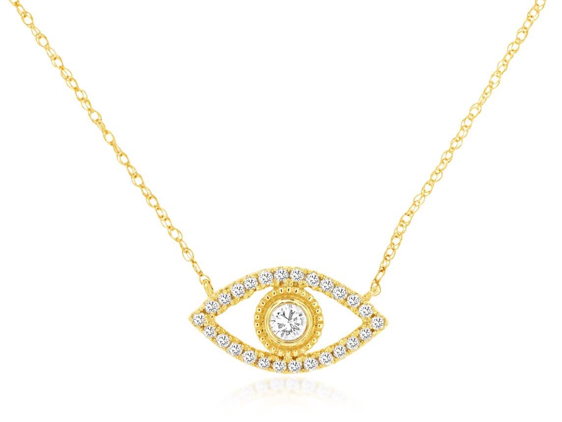 This 14kt gold eye necklace features a sparkling .24ct diamond, adding a touch of elegance to any outfit. Crafted with quality materials, this necklace is both stylish and durable. Expertly designed for a stunning visual impact, this necklace is a must-have for any jewelry collection.