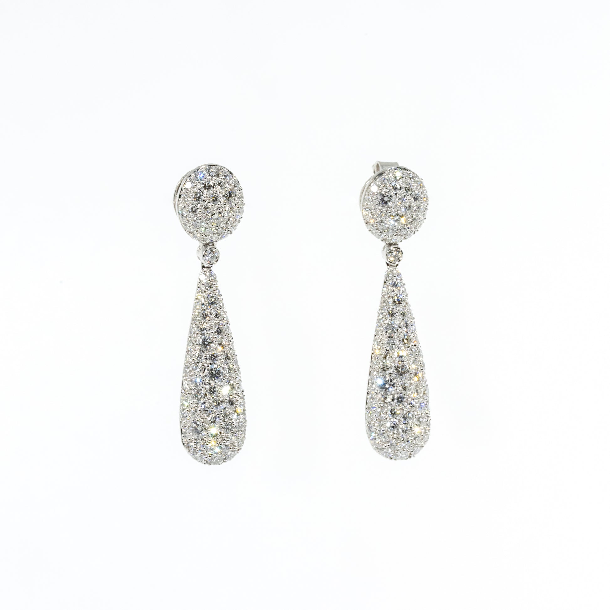 Expertly crafted, these 14kt white gold pave diamond earrings feature a stunning design with a total weight of 2.50 carats. The diamonds are of color G and clarity VS2, providing unparalleled brilliance and quality. Elevate any outfit with these elegant chandelier earrings.