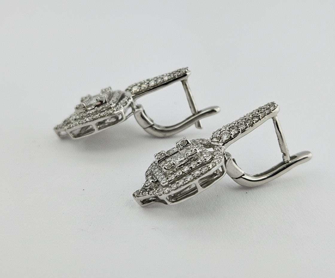 Crafted from 18K yellow gold, these natural diamond earrings feature a total diamond weight of 2.2 carats, including 0.48 carats of G-color, VS-SI clarity diamonds and 1.55 carats of emerald-cut stones. The refined design highlights the exceptional brilliance and clarity of the diamonds, offering a sophisticated and timeless elegance suitable for both everyday wear and special occasions. These earrings provide a luxurious statement with expert craftsmanship and enduring value.