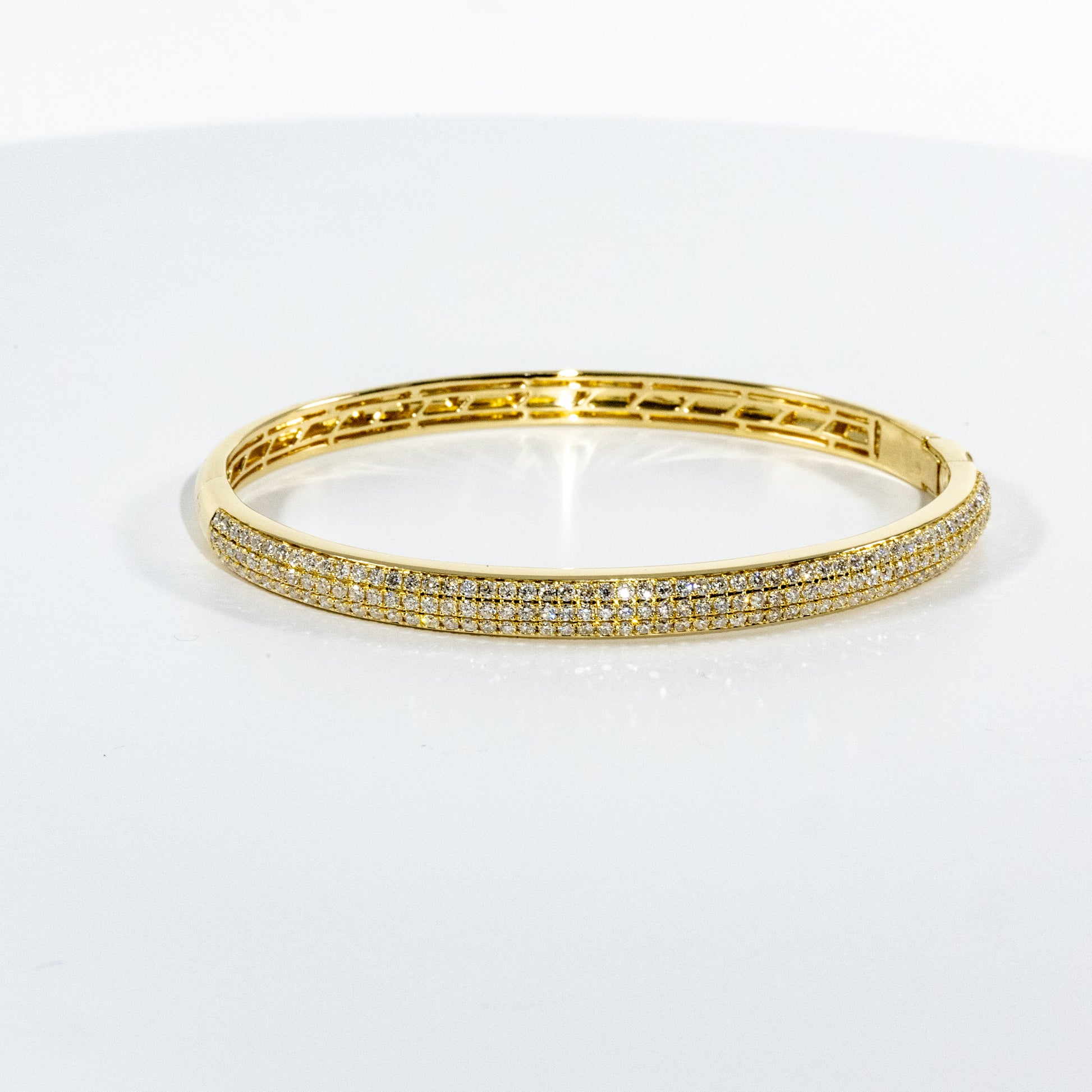 Crafted from 18kt yellow gold, this diamond bangle features three rows of exquisite diamonds with a total carat weight of 2.18. A true testament to luxury, this bangle is a must-have for any jewelry collection.